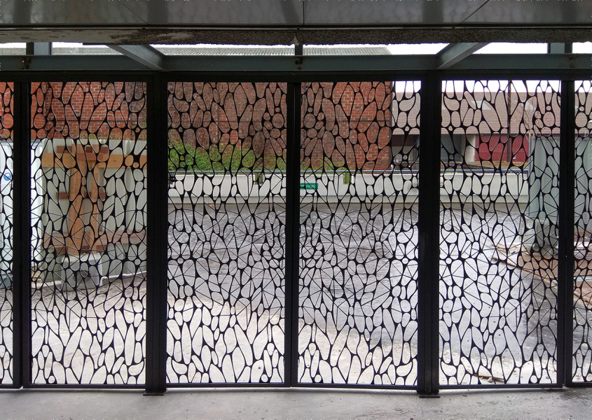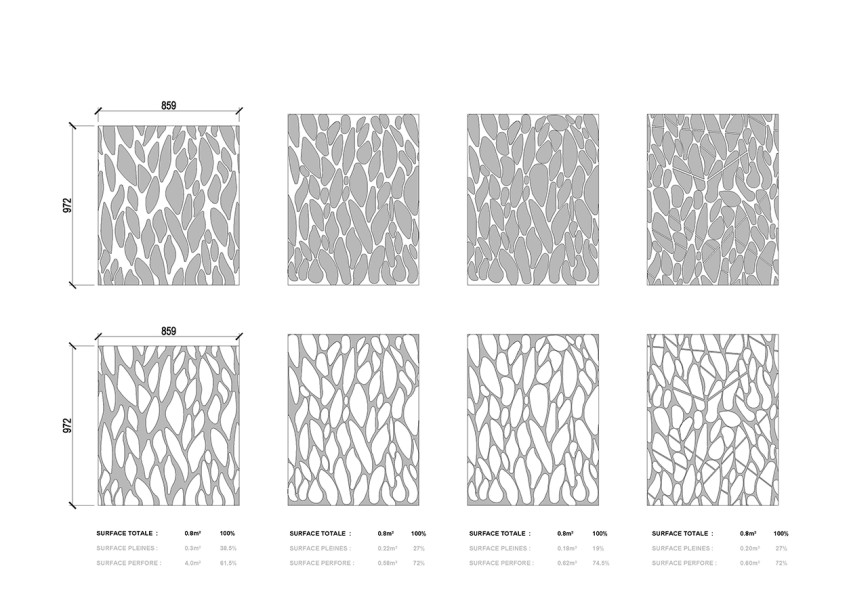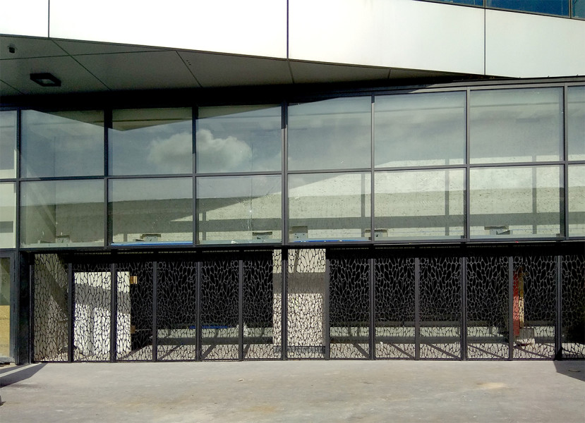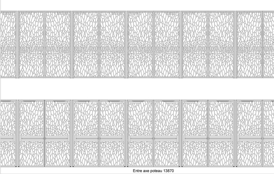 Projet: Il a fallut que cette résille métallique de forme organique puisse avoir un coefficient d’ouverture important pour correspondre au contraintes de désenfumage. Plusieurs motifs ont été envisagés. Résille métallique Bureaux Bercy Lumière